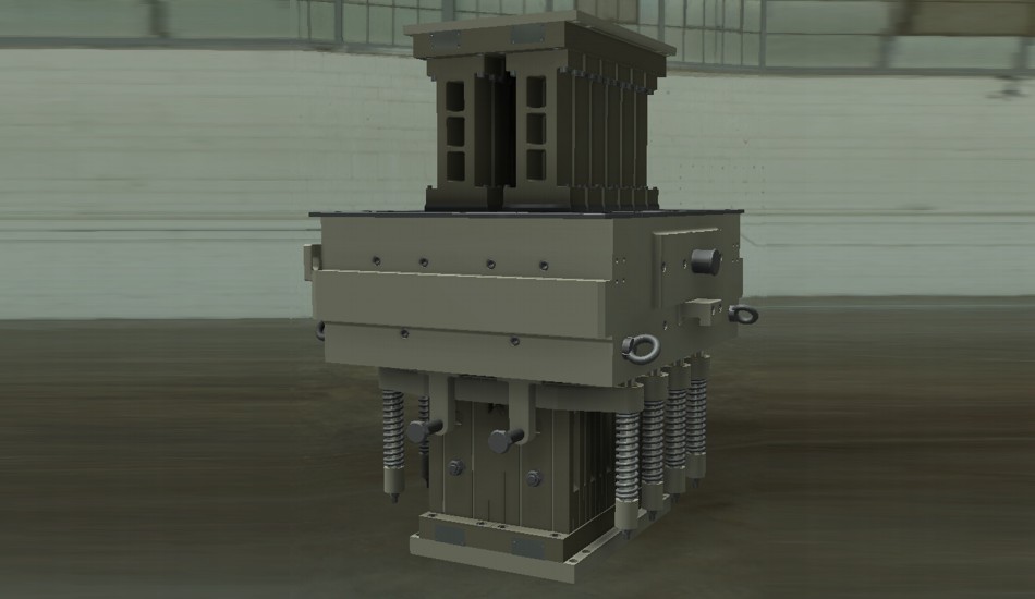 Servo motorically driven spindle press with a press force of 6,000 kN for the production of sand-lime bricks in a double strike action.